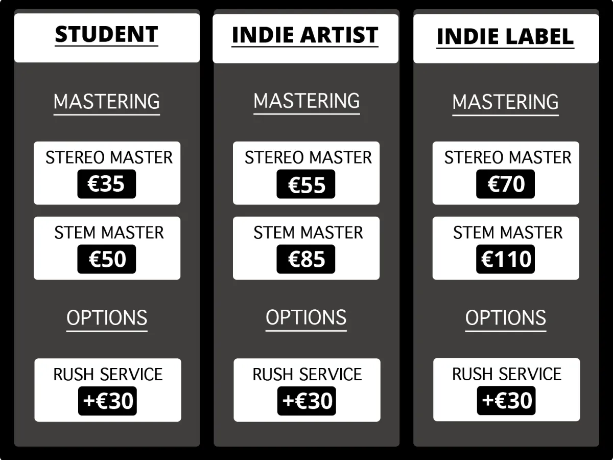 We stand 100% behind our work. That’s why every first mixing or mastering project with us is backed by our “Happy or Your Money Back” guarantee. No fine print, no 30-day nonsense — you either love the result and sign off on it, or you get your money back. Simple.